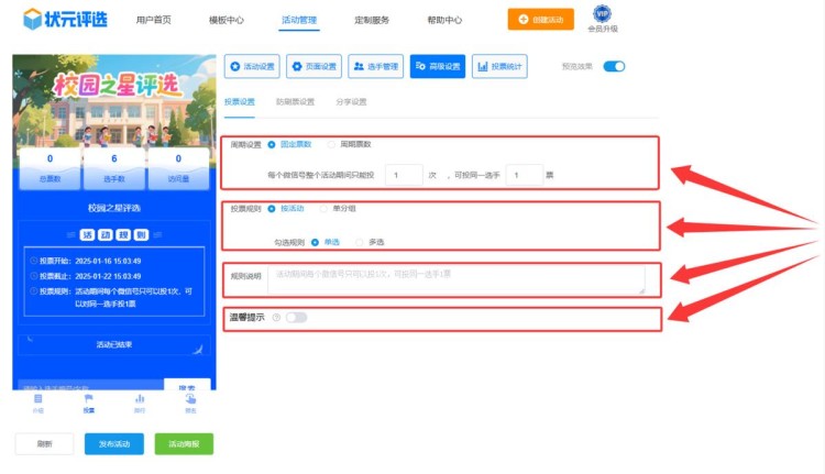 新手对制作网络投票活动一头雾水?别慌,这份保姆级教程手把手带您搞定。网络投票活动作为数字化时代的便捷评选方式,打破了时空限制,让更多人能参与到对优秀个体、优质作品或重要事件的评价中。它不仅是一种选拔机制,更承载着凝聚共识、传播价值的意义 —— 通过展示候选人的事迹与成果,能让榜样力量、创新精神等正向价值被广泛看见;借助大众投票的互动过程,可激发群体参与热情,增强活动的传播力与影响力。同时,规范的网络投票能体现公平性,让每一份支持都被量化,既为组织者提供高效的评选工具,也让参与者在指尖互动中感受到“我的声音有分量”,最终实现“评选促宣传、参与聚共识”的双重价值。