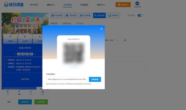 最后,点击【发布活动】,系统会自动生成投票链接和二维码。这样一场网络评选活动就制作完成了,是不是很简单?