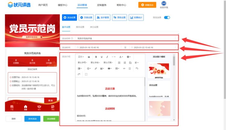 第三步,在【活动设置】中,将活动名称改为党员示范岗评选,并设置活动起止时间、编辑活动介绍。