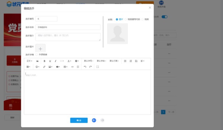 第五步,在【选手管理】中,上传所有选手的个人资料,包括选手的名称、简介、照片或者视频等。