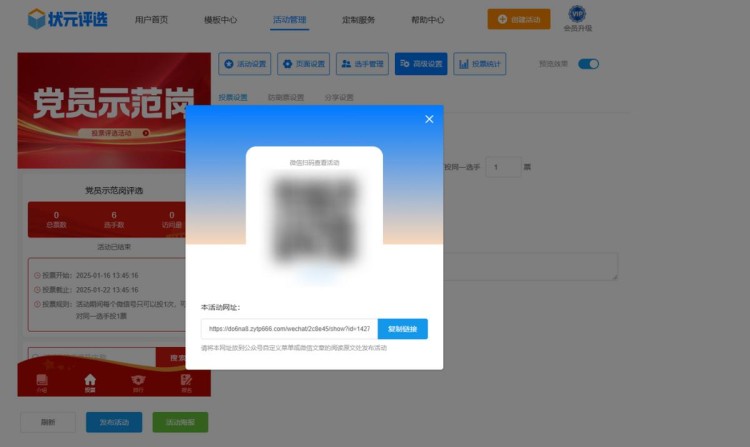 第七步,上面这些步骤完成,且仔细检查确定无误后,点击【发布活动】,系统会自动生成投票链接和二维码。这样党员示范岗网络评选活动就制作完成了,您学会了吗?