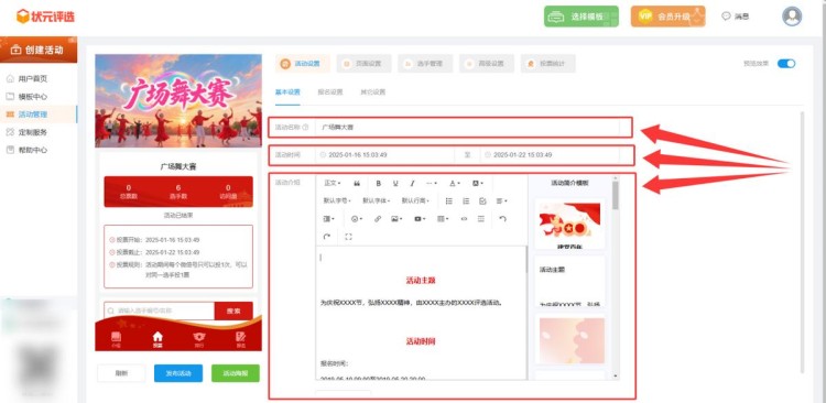 第三步,在【活动设置】中,修改活动名称、设置活动起止时间、编辑活动介绍。
