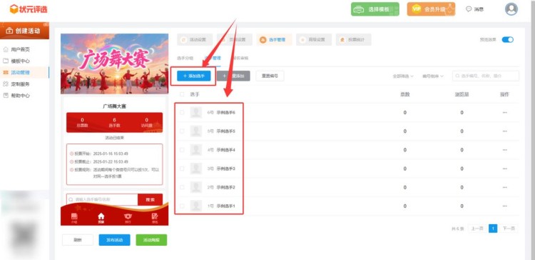 第五步,在【选手管理】中,上传所有选手的个人资料,包括选手的名称、简介、照片或者视频等。