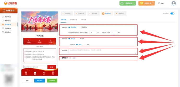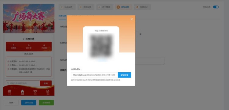 第七步,上述步骤完成,且仔细检查确定无误后,点击【发布活动】,系统会自动生成投票链接和二维码。将其保存下来并分享出去,即可开启网络评选活动,选出最终的获胜者。