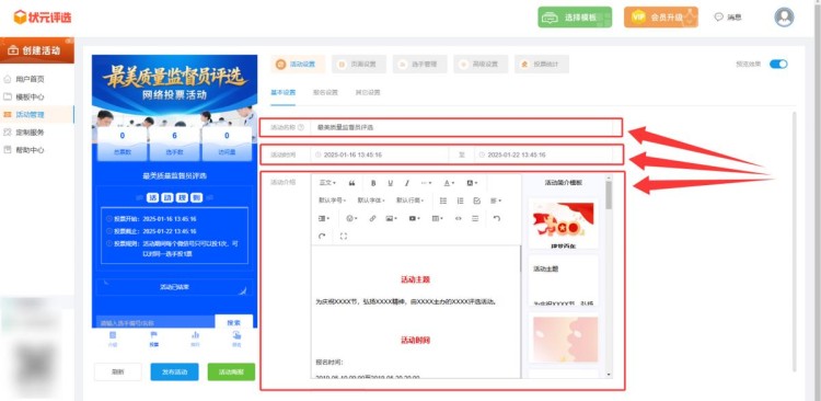 再者,在【活动设置】中,将活动名称改为最美质量监督员评选,并设置活动时间、编辑活动介绍。