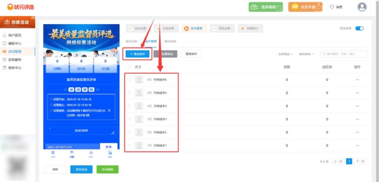 然后,在【选手管理】中,上传所有选手的个人资料,包括选手的名称、简介、照片或者视频等。