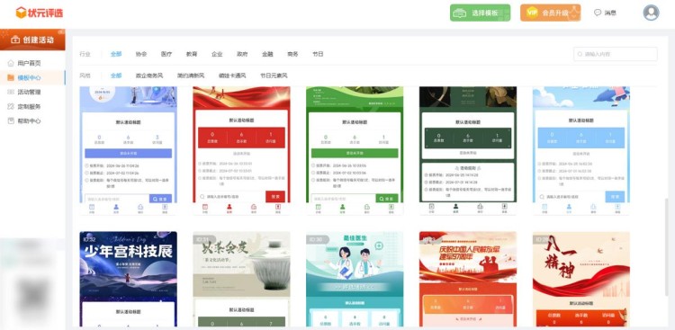 其次,成功登录后,系统会自动跳转至活动后台。点击【模板中心】,选定合适的模板后可直接一键套用。