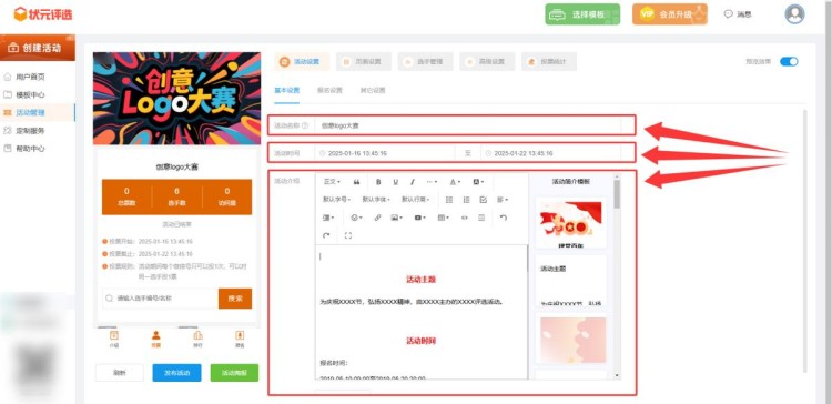 再者,在【活动设置】中,将活动名称改为创意logo大赛,并设置活动开始和结束的时间,编辑活动介绍。