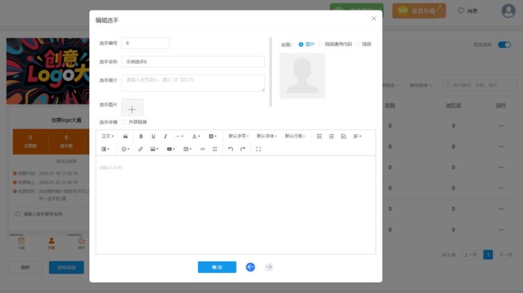 然后,在【选手管理】中,上传所有选手的个人资料,包括选手的名称、简介、照片或者视频等。