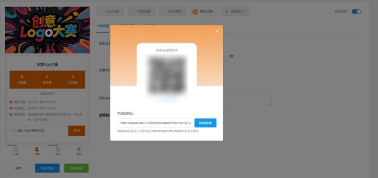 最后,上面这些操作完成后,点击【发布活动】,系统会自动生成投票链接和二维码。这样创意logo大赛网络评选活动就制作完成了,是不是很简单?