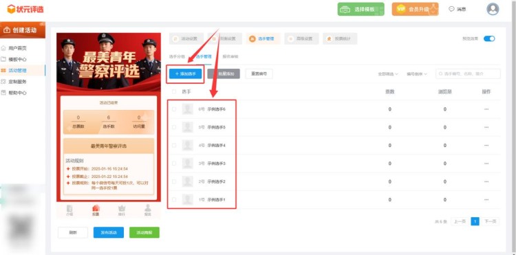 第五步,在【选手管理】中,上传所有选手的个人资料,包括选手的名称、简介、照片或者视频等。