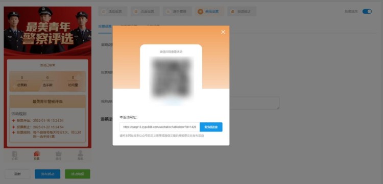 第七步,上述操作完成后,点击【发布活动】,系统会自动生成投票链接和二维码。这样最美青年警察网络评选活动就制作完成了,您学会了吗?