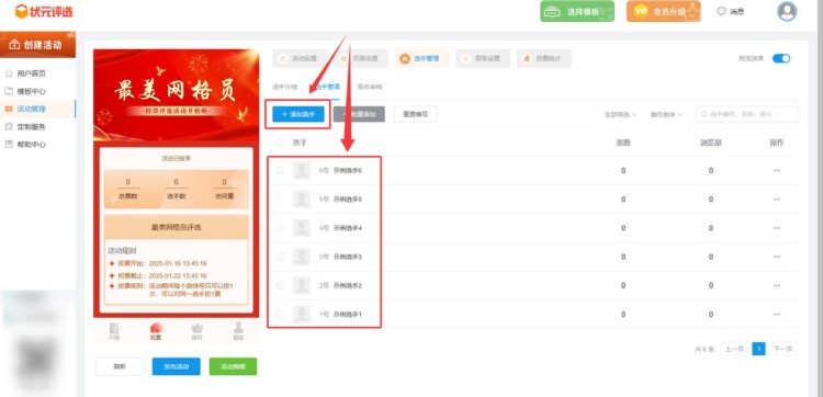 第五步,在【选手管理】中,上传所有选手的个人资料,包括选手的名称、简介、照片或者视频等。