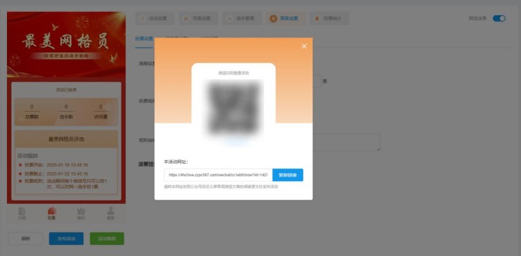 第七步,上述步骤完成后,点击【发布活动】,系统会自动生成投票链接和二维码。将其保存下来并分享出去,即可开启网络评选活动,选出最终的获胜者。