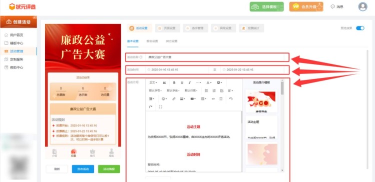 第三步,在【活动设置】中,将活动名称改为廉政公益广告大赛,并设置活动开始和结束的时间,编辑活动介绍。