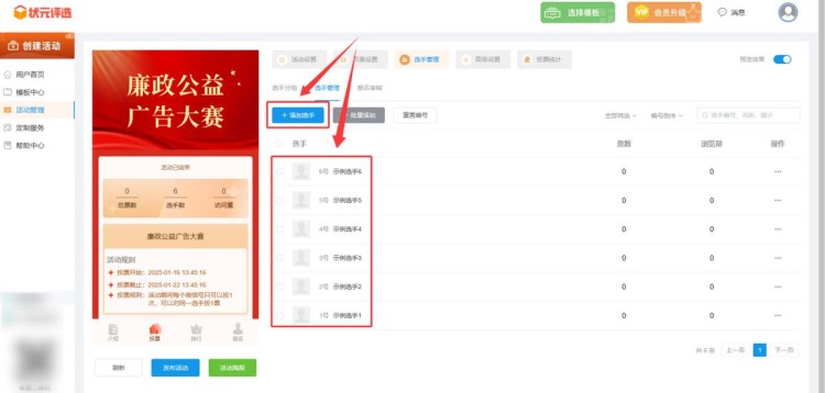 第五步,在【选手管理】中,上传所有选手的个人资料,包括选手的名称、简介、照片或者视频等。