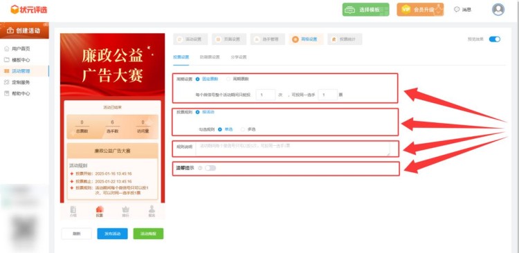 第六步,在【高级设置】中,完成投票规则的设置,如活动期间,可以给几名选手投票、又能够投几票等。