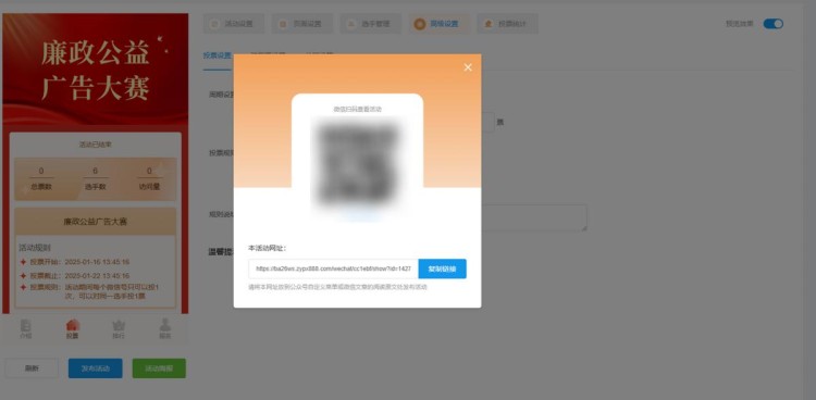 第七步,上述操作完成后,点击【发布活动】,系统会自动生成投票链接和二维码。这样廉政公益广告大赛网络评选活动就制作完成了,您学会了吗?