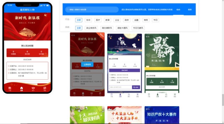 其次,登录后,系统会自动跳转至活动后台。在【模板中心】,选定合适的模板后可直接一键套用。