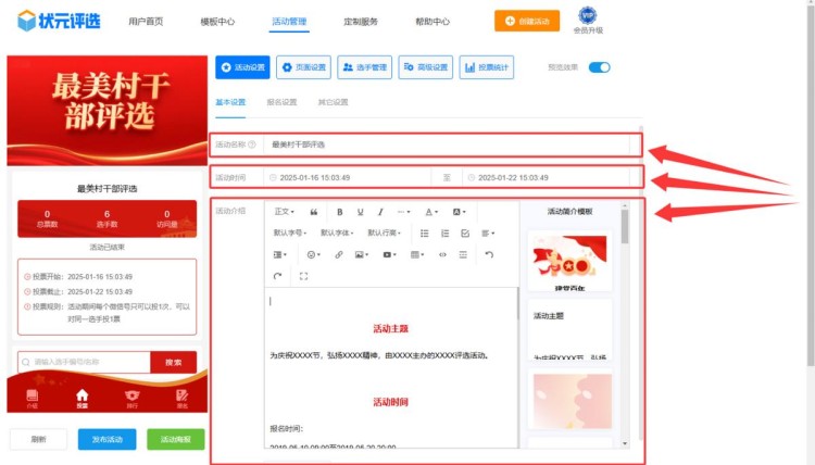再者,在【活动设置】中,编辑活动信息,包括活动名称、时间、简介。