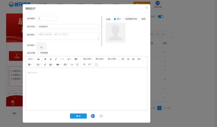 然后,在【选手管理】中,上传所有选手的个人资料,包括选手的名称、简介、照片或者视频等。