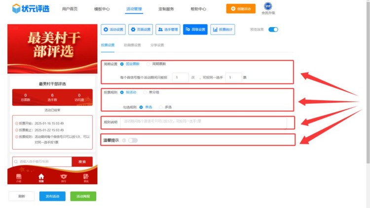 网络投票制作工具不知道怎么用?别担心,简单几步就能教会您。无需复杂技术知识,打开工具后先填写活动名称、时间等基础信息,接着上传候选人资料,选个喜欢的模板稍作调整,再根据需求设置投票规则,比如每日可投次数,最后保存生成链接就能分享了。全程操作直观易懂,跟着指引走,小白也能快速上手,轻松搞定投票活动制作。