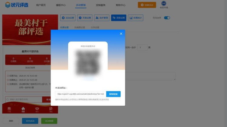 最后,点击【发布活动】,系统会自动生成投票链接和二维码。这样一场网络评选活动就制作完成了,是不是很简单?