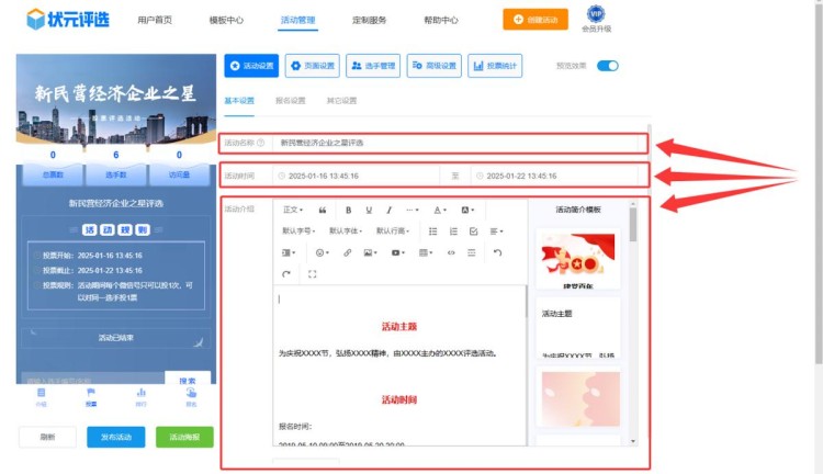 第三步,在【活动设置】中,将活动名称改为新民营经济企业之星评选,并设置活动开始和结束的时间,编辑活动介绍。