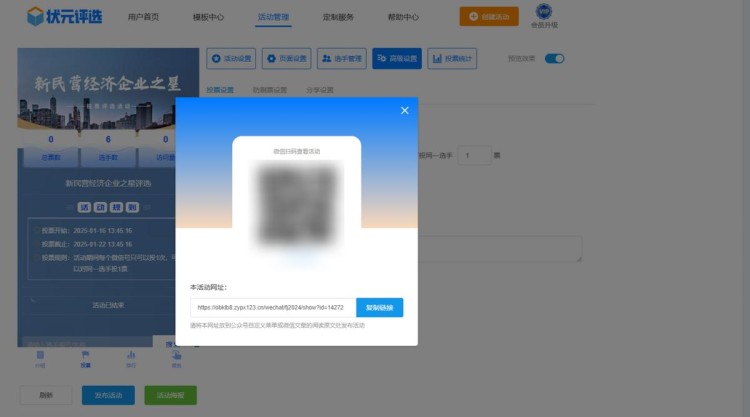 第七步,上述步骤完成,且仔细检查确定无误后,点击【发布活动】,系统会自动生成投票链接和二维码。这样新民营经济企业之星网络评选活动就制作完成了,您学会了吗?
