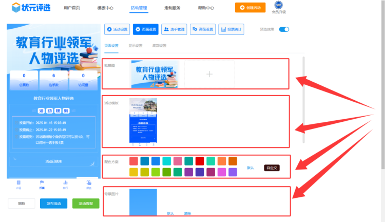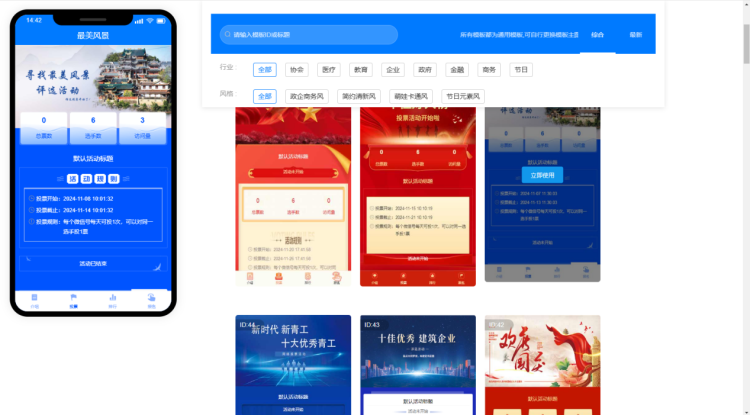 第二步,成功登录后,系统会自动跳转至活动后台。在【模板中心】,可以选择与主题相契合的模板,如知识产权十大事件、创业之星、交警之星等模板。