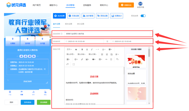 第三步,在【活动设置】中,修改活动名称、设置活动开始和结束的时间、编辑活动介绍。