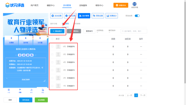 第五步,在【选手管理】中,上传所有选手的个人资料,包括选手的名称、简介、照片或者视频等。