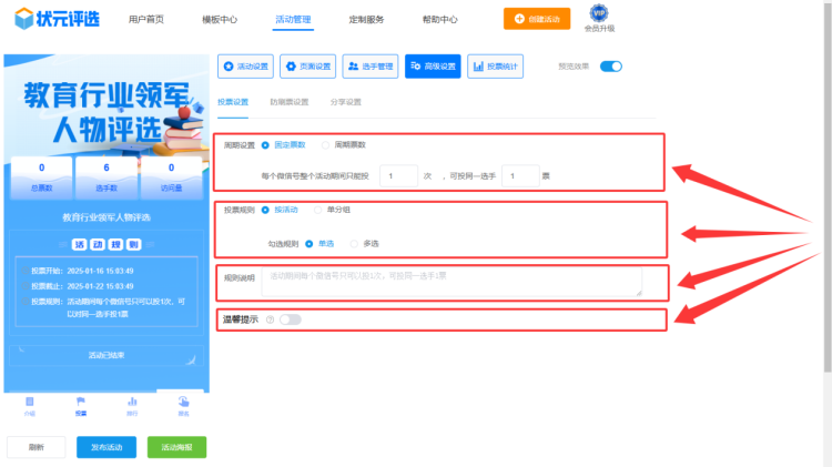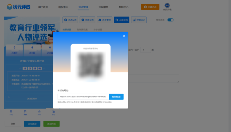 第七步,上述步骤完成,且仔细检查确定无误后,点击【发布活动】,系统会自动生成投票链接和二维码。将其保存下来并分享出去,即可开启投票评选活动,选出最终的获胜者。