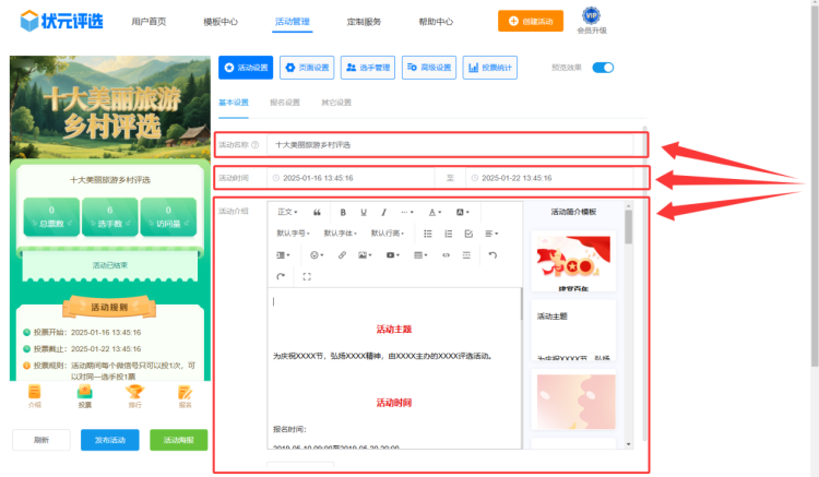 第三步,在【活动设置】中,将活动名称改为十大美丽旅游乡村评选,并设置活动起止时间、编辑活动介绍。