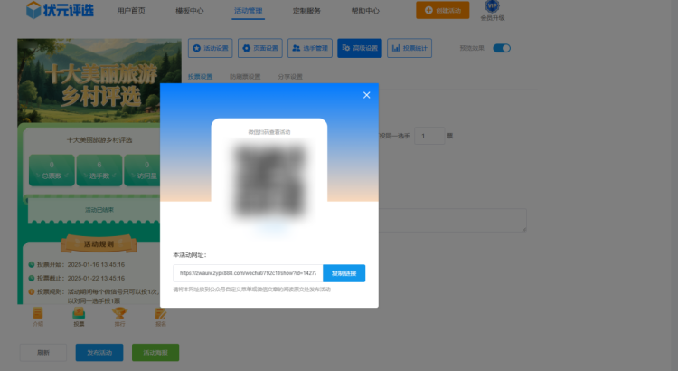 第七步,点击【发布活动】,系统会自动生成投票链接和二维码。这样十大美丽旅游乡村网络投票评选活动就制作完成了,您学会了吗?