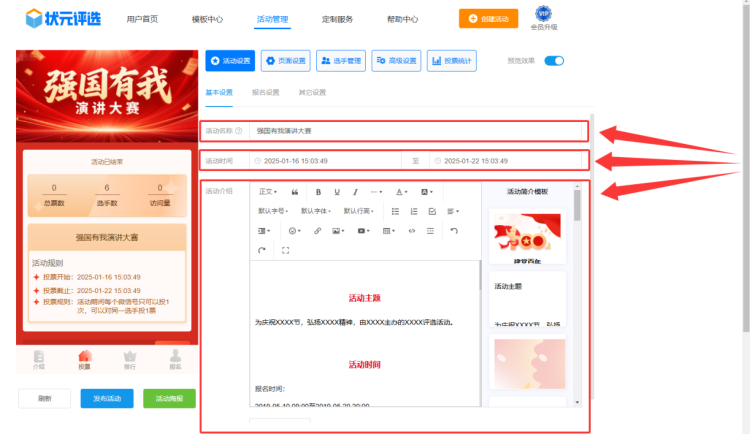 再者,在【活动设置】中,编辑活动信息,包括活动名称、时间、简介。