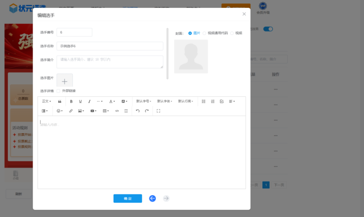 然后,在【选手管理】中,上传所有选手的个人资料,包括选手名称、简介、照片或者视频等。