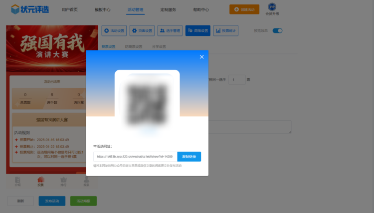 最后,点击【发布活动】,系统会自动生成投票链接和二维码。这样一场网络投票评选活动就制作完成了,是不是很简单?