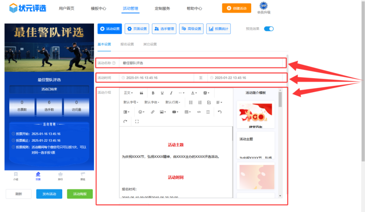 第三步,在【活动设置】中,将活动名称改为最佳警队评选,并设置活动起止时间、编辑活动介绍。