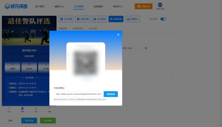 第七步,上述操作完成后,点击【发布活动】,系统会自动生成投票链接和二维码。这样最佳警队在线投票评选活动就制作完成了,是不是很简单?