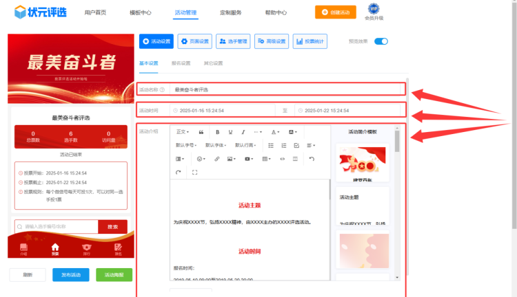 第三步,在【活动设置】中,修改活动名称、设置活动时间、编辑活动介绍。