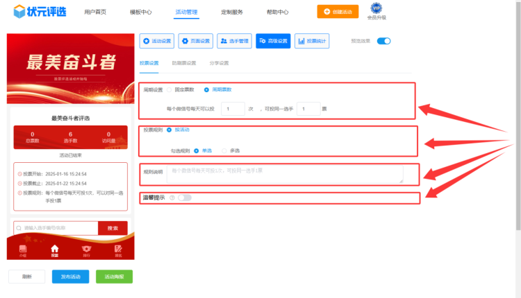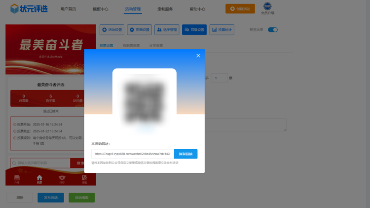 第七步,上述步骤完成,且仔细检查确定无误后,点击【发布活动】,系统会自动生成投票链接和二维码。将其保存下来并分享出去,即可开启投票评选活动,选出最终的获胜者。