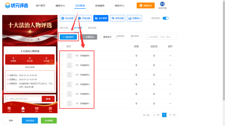 第五步,在【选手管理】中,上传所有选手的个人资料,包括选手的名称、简介、照片或者视频等。