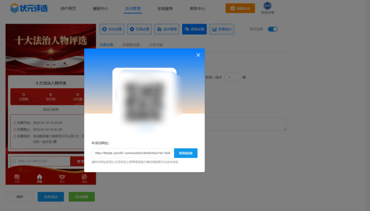 第七步,上述步骤操作完成,且仔细检查确定无误后,点击【活动海报】,系统会自动生成投票活动的海报二维码。将其保存下来并分享出去,用户即可通过点击扫描二维码进入活动,投票选出最终的获胜者了!