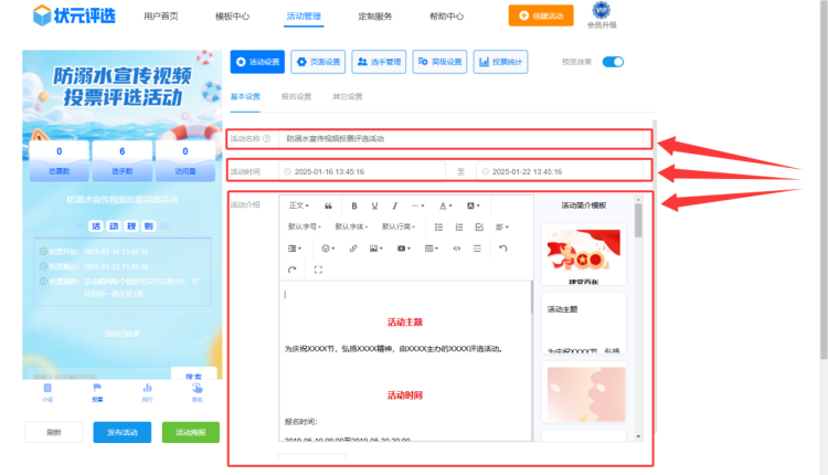 第三步,在【活动设置】中,将活动名称改为防溺水宣传视频评选,并设置活动开始和结束的时间、编辑活动介绍。