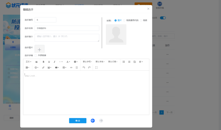 第五步,在【选手管理】中,上传所有选手的个人资料,包括选手的名称、简介、照片或者视频等。