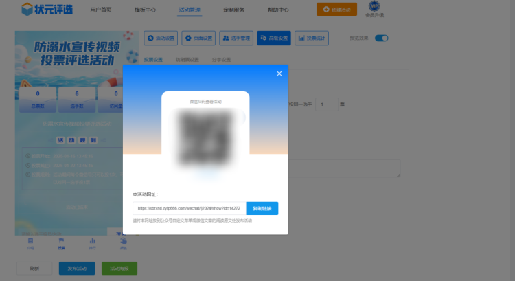 第七步,点击【发布活动】,系统会自动生成投票链接和二维码。这样一场防溺水宣传视频在线投票评选活动就制作完成了,是不是很简单?
