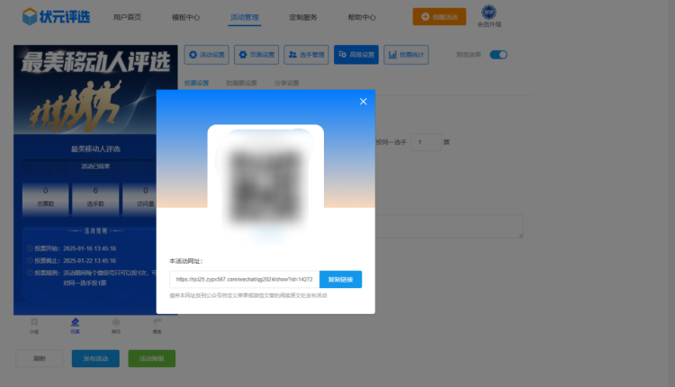 第七步,上述操作完成后,点击【发布活动】,系统会自动生成投票链接和二维码。这样最美移动人网络投票评选活动就制作完成了,是不是很简单?