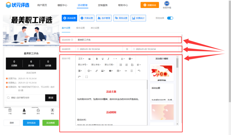 第三步,设置活动信息:在【活动设置】中,修改活动名称,使其简洁明了且突出主题,如[公司名称] 最佳职工评选。设置活动的开始和结束时间。同时,编辑活动介绍,详细说明活动的背景、目的、评选标准以及奖项设置等内容。