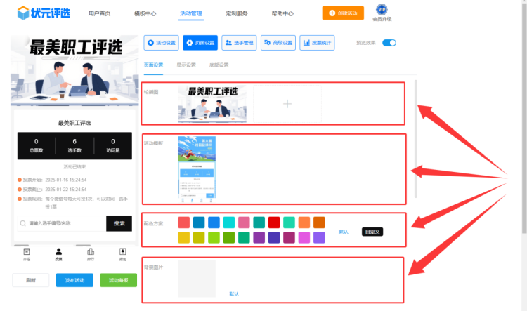 第四步,个性化页面设置:进入【页面设置】,上传与活动主题相关的主题轮播图,图片要清晰、美观且具有吸引力。根据轮播图的颜色,调整配色方案,使页面整体风格协调统一。还可以根据活动需要,添加背景音乐、漂浮物等,增强活动的趣味性和互动性。